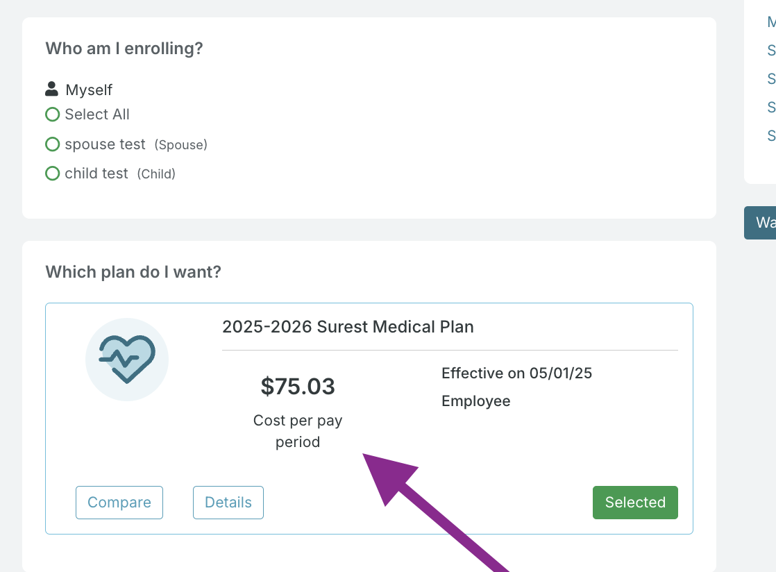 - How much will it cost? The cost per pay period will change on the screen as you add dependents to the plan. For example, in the first screenshot below for employee-only coverage, the medical plan costs $75.03 per pay. In the second screenshot, all dependents have been selected, and the cost per pay changed to $185.64.