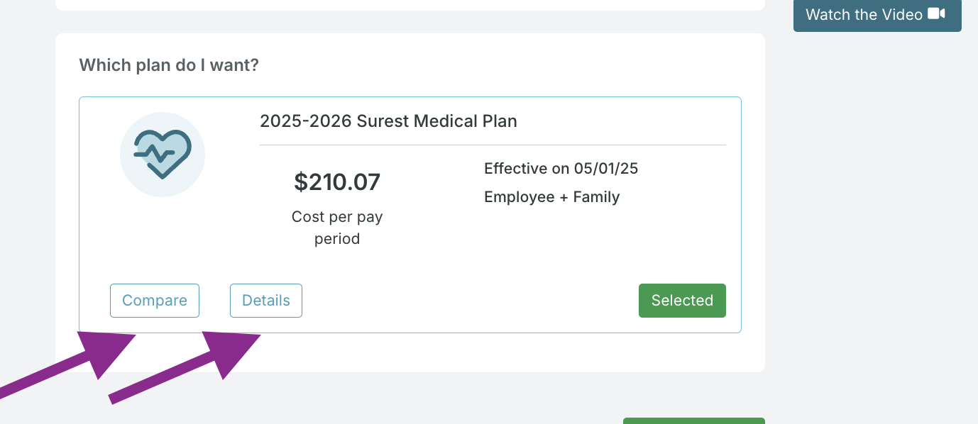- Compare and Details—Click the Compare button to see a side-by-side comparison of the current insurance plan and the plan available during open enrollment. This is a great way to understand if your costs or coverage are changing.