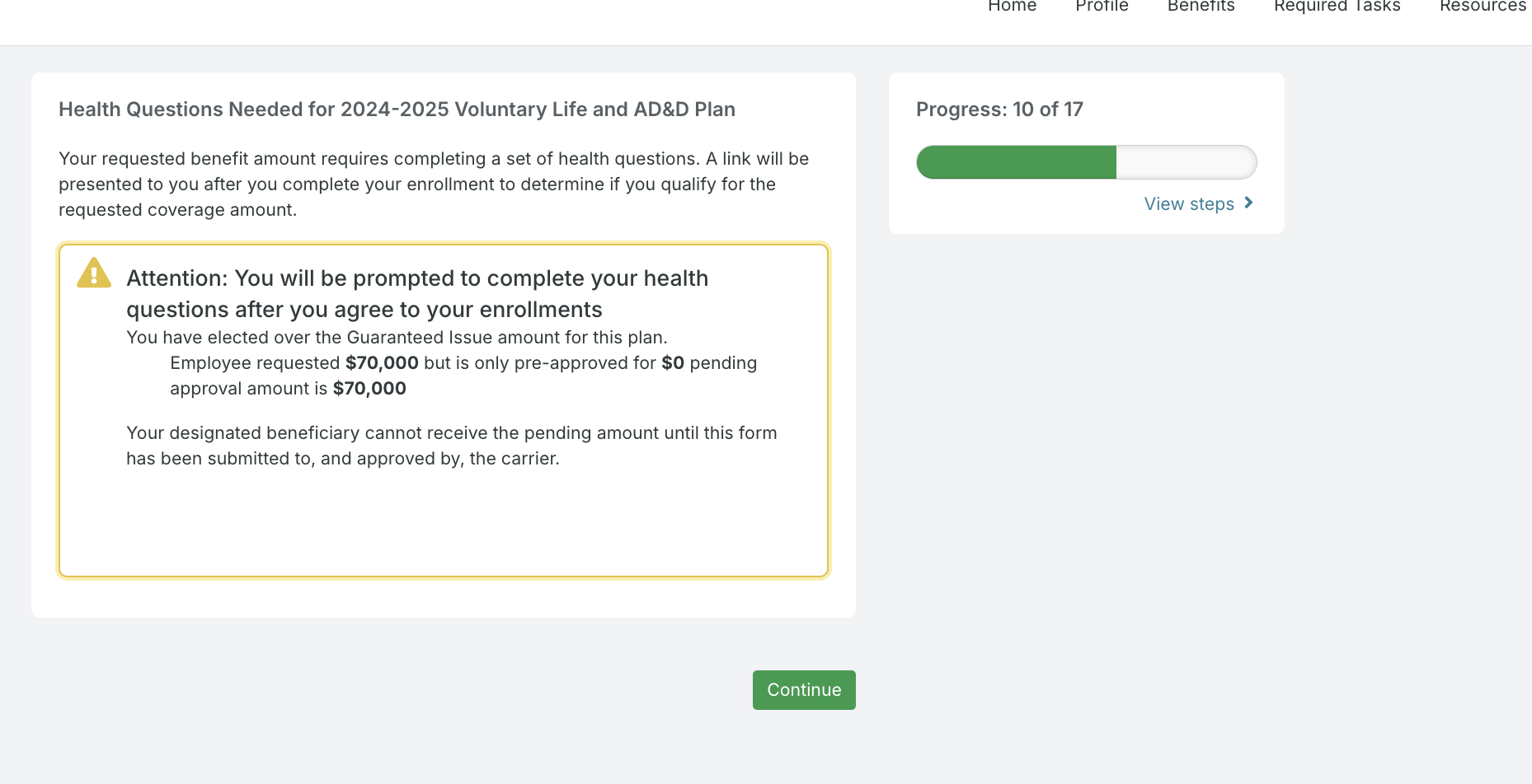 If you have elected benefits that require a beneficiary designation or completion of an Evidence of Insurability form, you will be prompted to add in those details throughout the enrollment process.