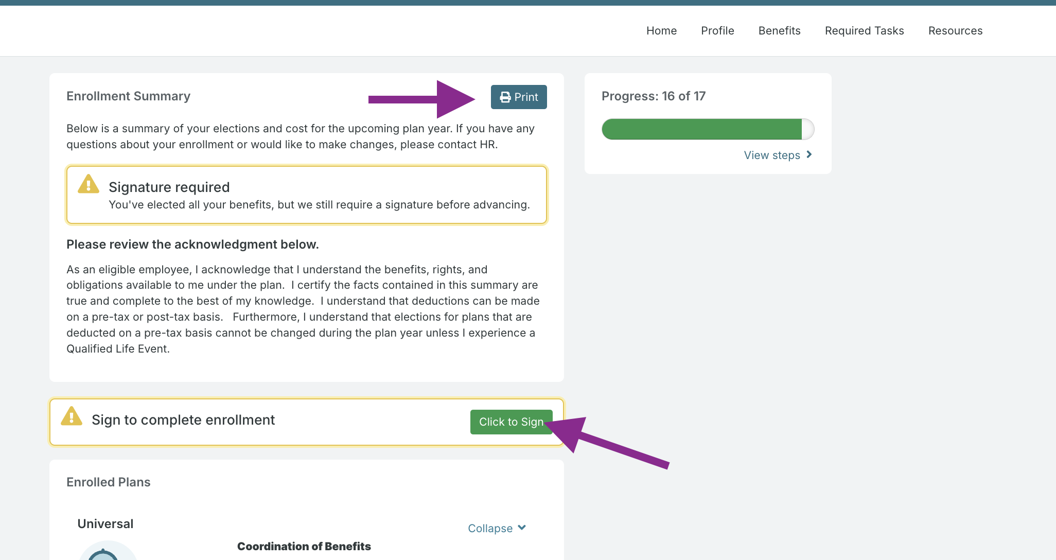 Please look over the open enrollment benefits you selected on the enrollment summary page to make sure they are correct, then click Click to Sign to complete your enrollment. You can either print a summary of your elections for your records or log in at any point during the year to view your summary online.