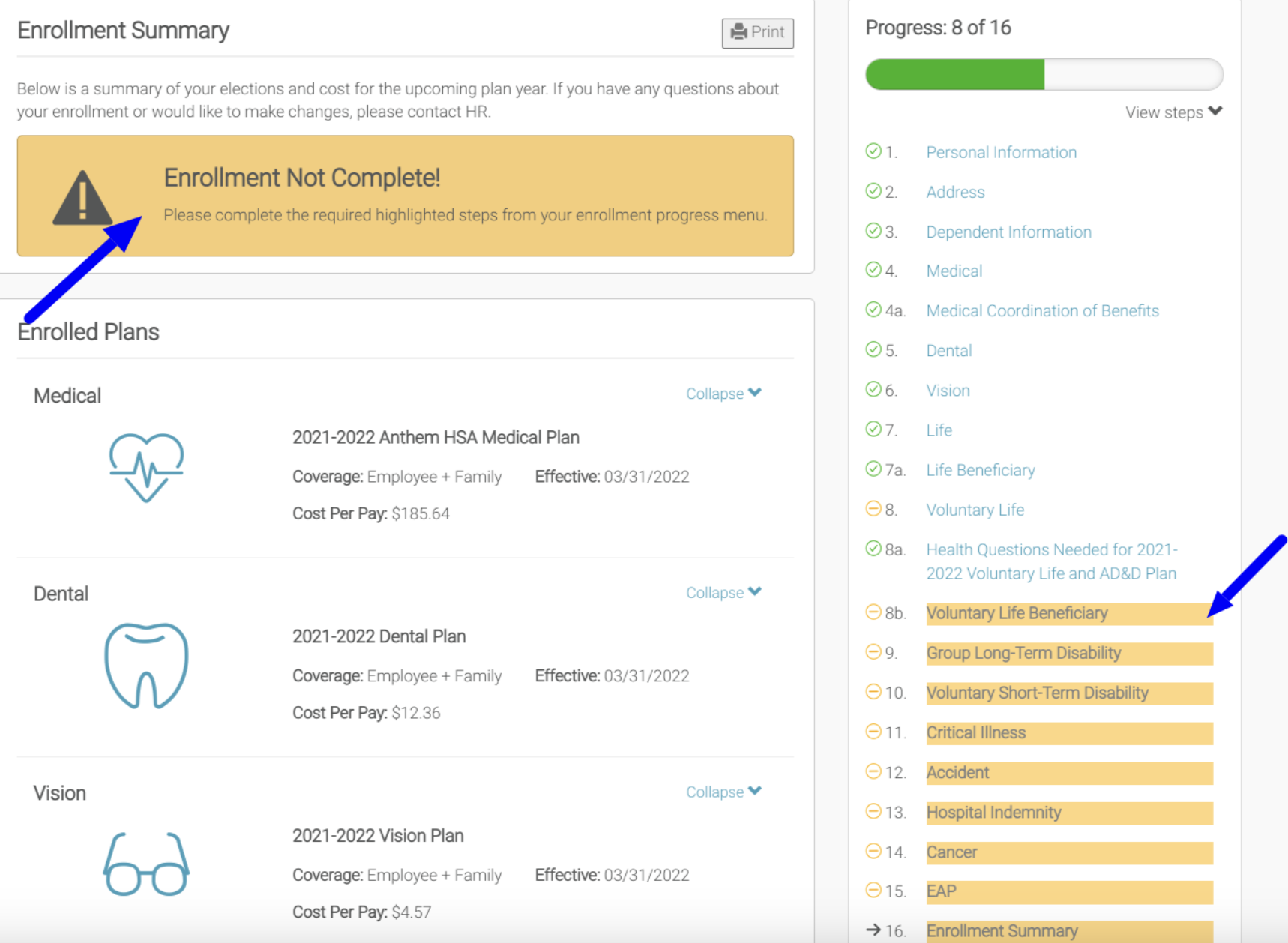 Tip: If you miss a step, you’ll see Enrollment Not Complete in the progress bar with the incomplete steps highlighted. Click on any incomplete steps to complete them. You must make an election for each benefit offered, even if you are waiving the benefit. You cannot skip any step in the open enrollment process.