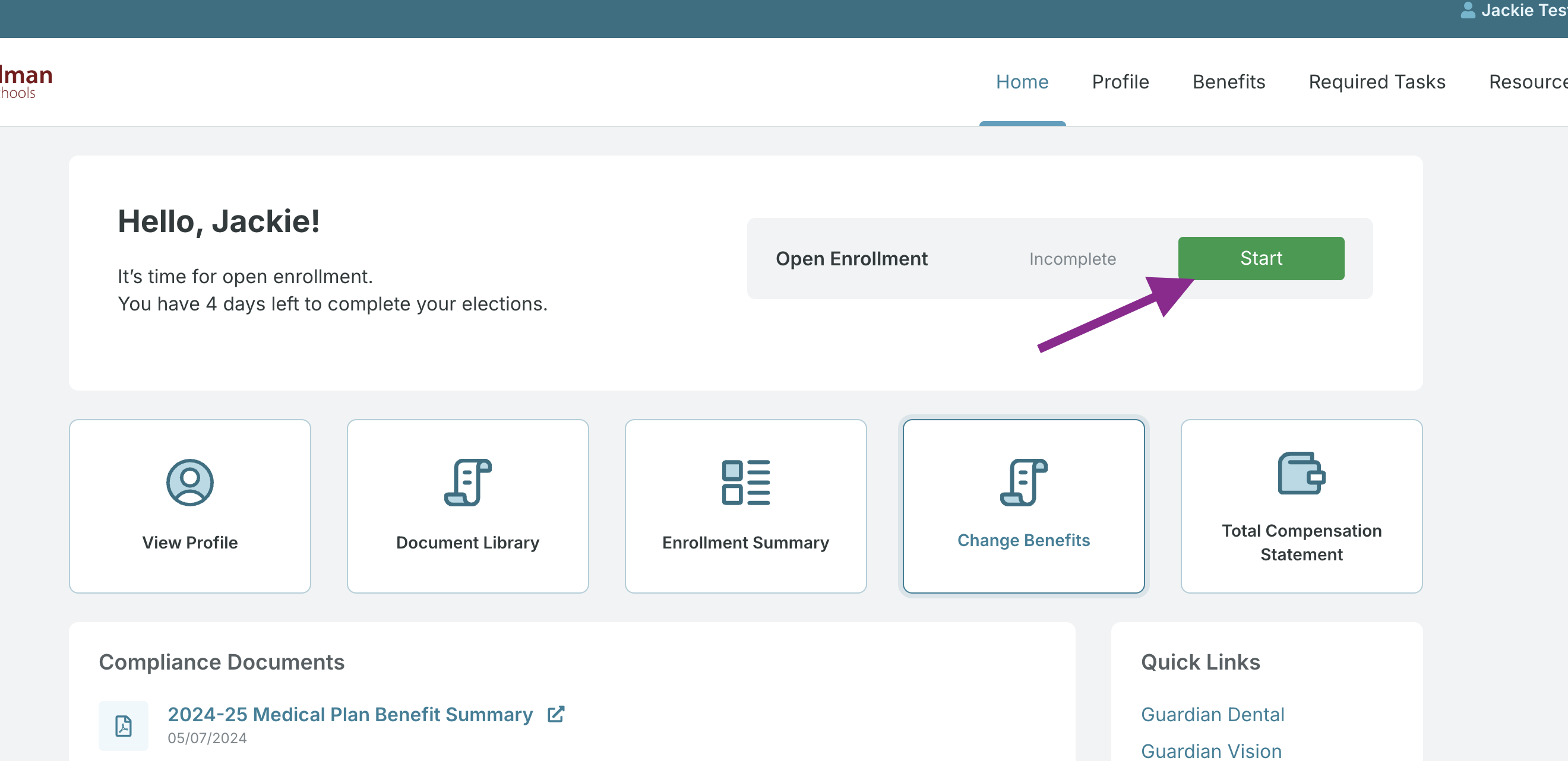 Step 4: Start Open Enrollment: Click on Start. You’ll need to complete some personal and dependent information before proceeding to your open enrollment benefit elections.