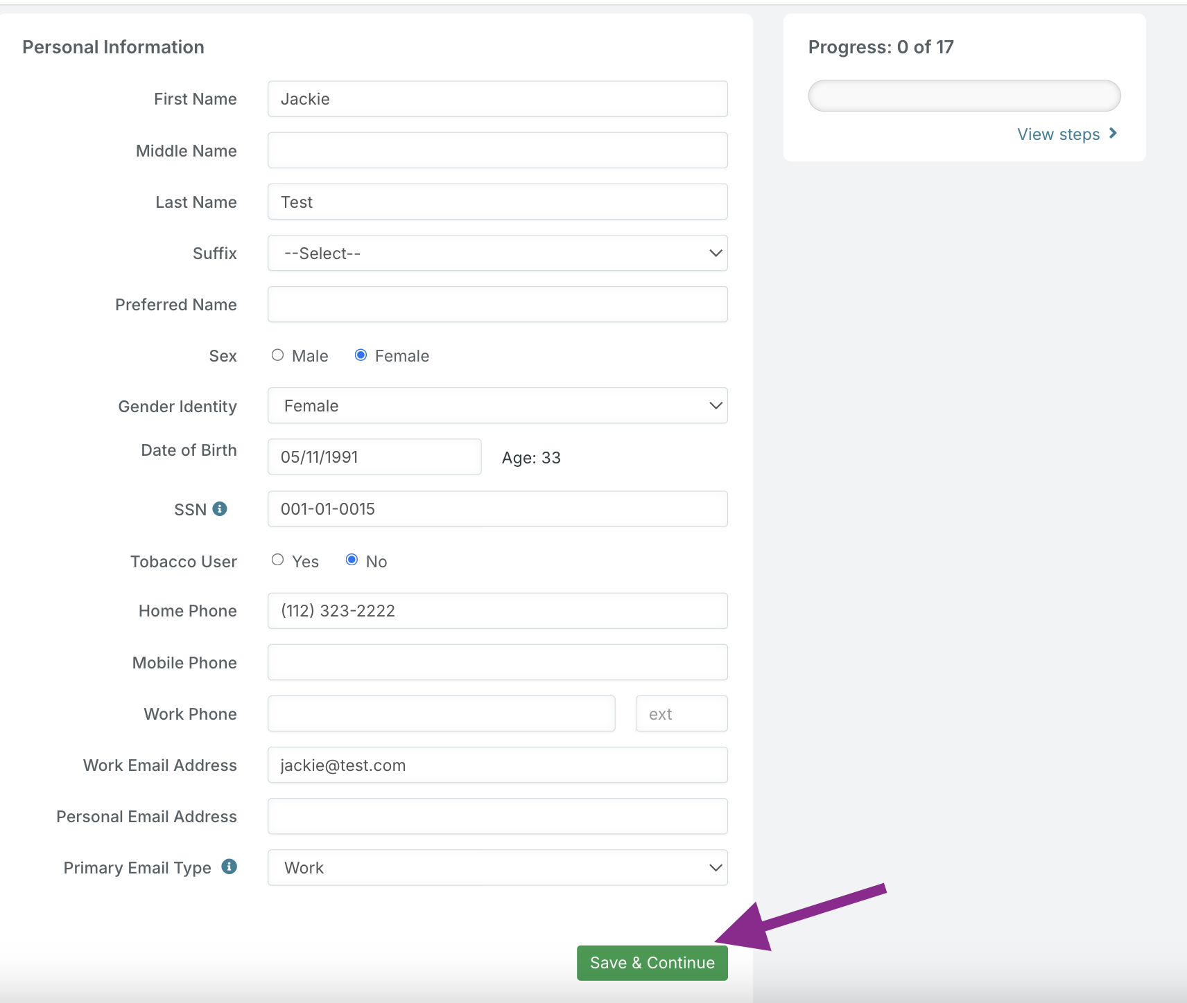 Step 5: Personal Information- Verify/Edit your personal information and click Save & Continue.