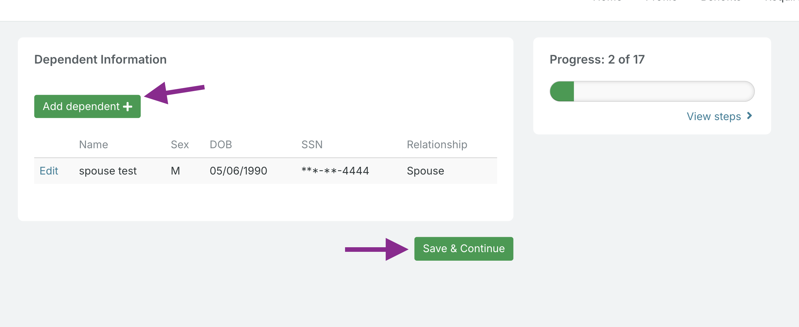 Step 7: Dependent Information- To add dependents, click on Add Dependent + and add your dependents. Then, click Save & Continue. If you do not have dependents, just click Save & Continue.