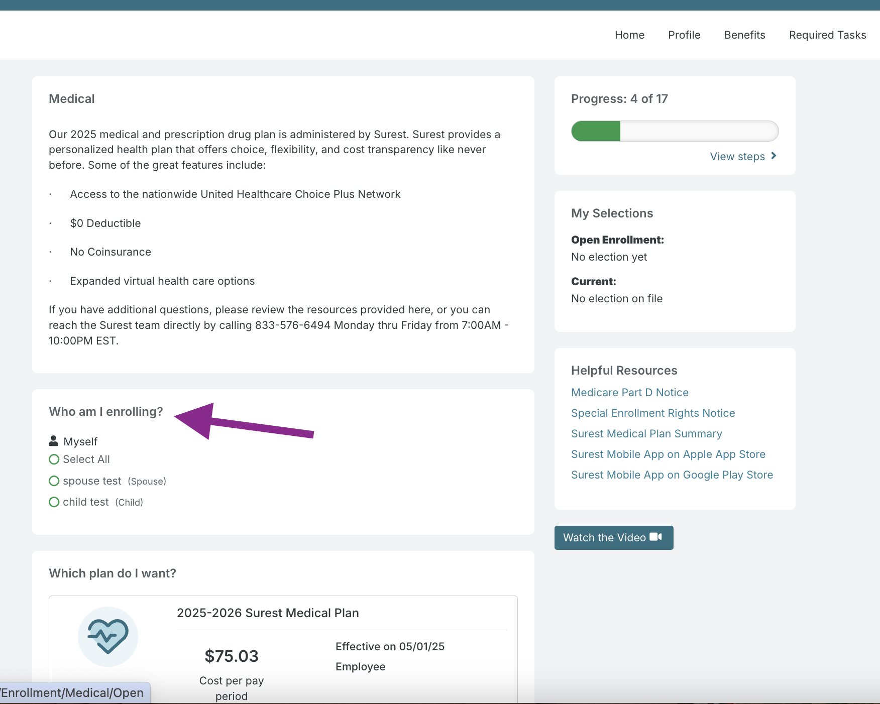 - Who am I enrolling?- In this section, you will select who will be covered on the plan. The system automatically includes you, the employee. If you would like to cover your dependents, you MUST select the dependent(s) you wish to cover on the plan. It's important to click on each dependent you would like to cover on the plan.