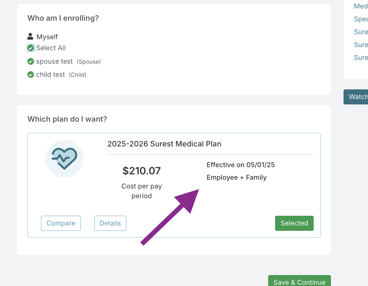 - What plan do I want? You will select the plan you would like to enroll in. Be sure that you have followed the steps above and have clicked on the dependents that you would like to cover on the plan. Click on Selected next to the plan you would like to enroll in and then click Save & Continue.