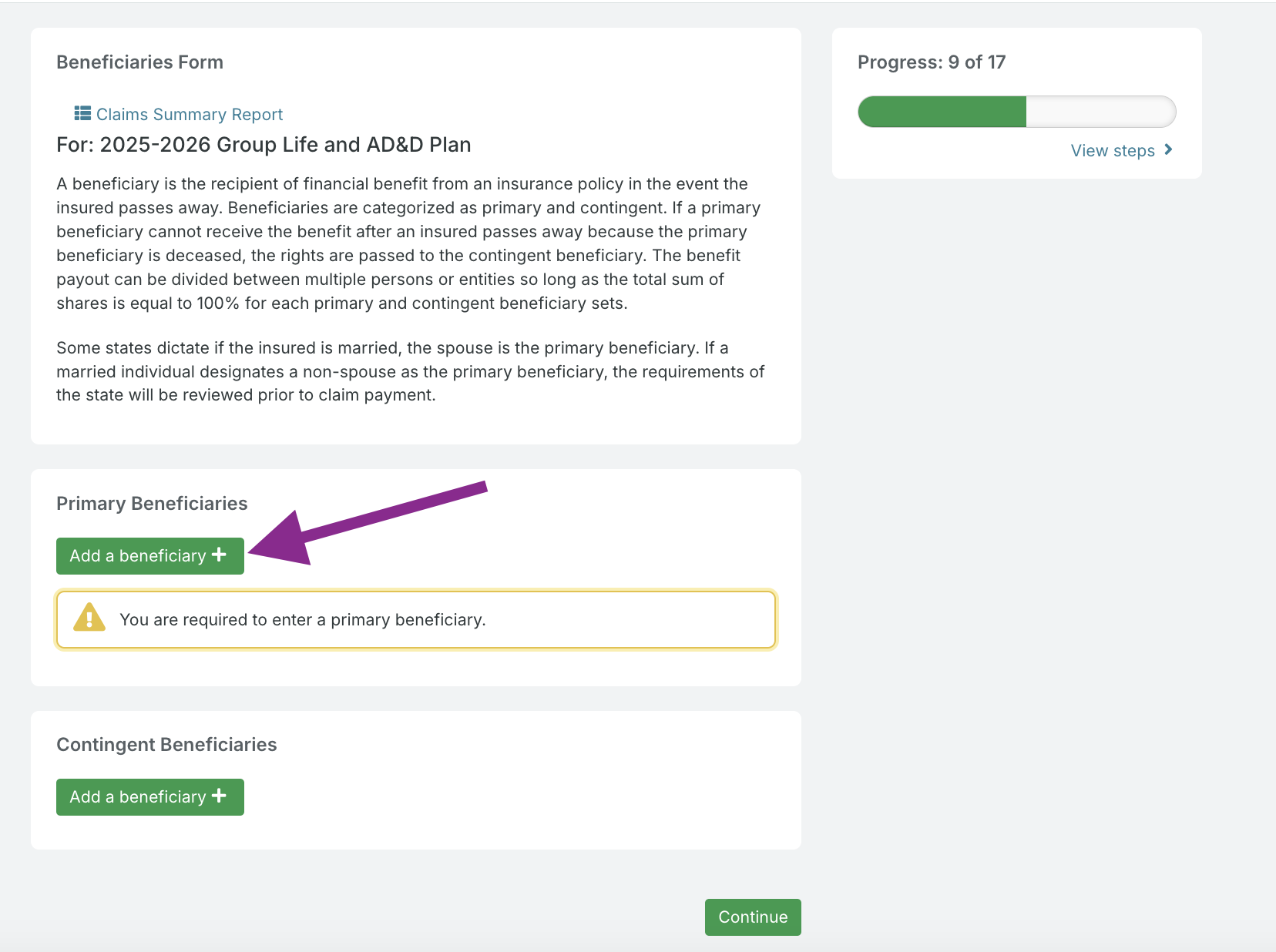 - Beneficiary Forms- To add a beneficiary, click on Add a Beneficiary + and complete the required steps. Then, click Continue. You must allocate 100% to a beneficiary/beneficiaries.
